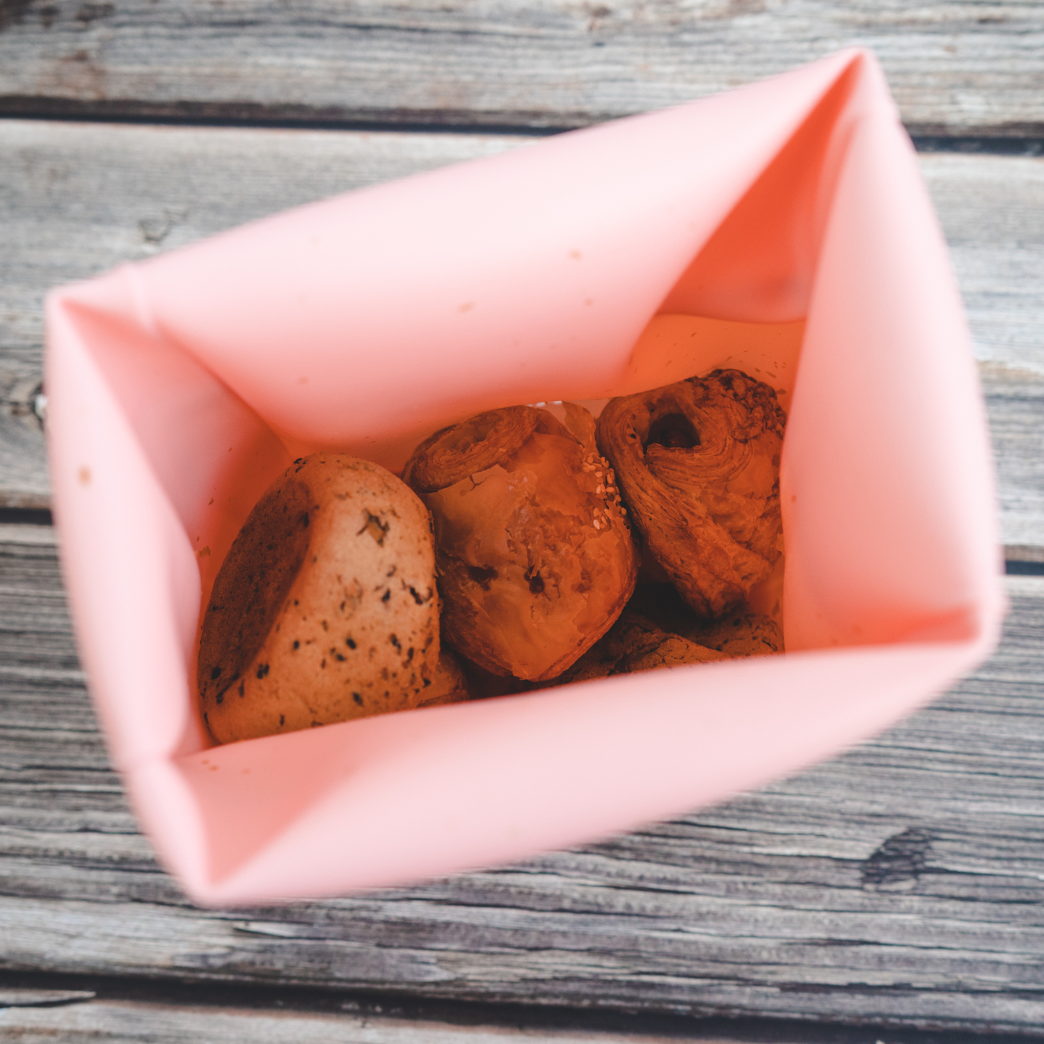 食品級矽膠,用來裝熱食也很OK,袋口能旋轉束緊的綁繩,收納起來更衛生