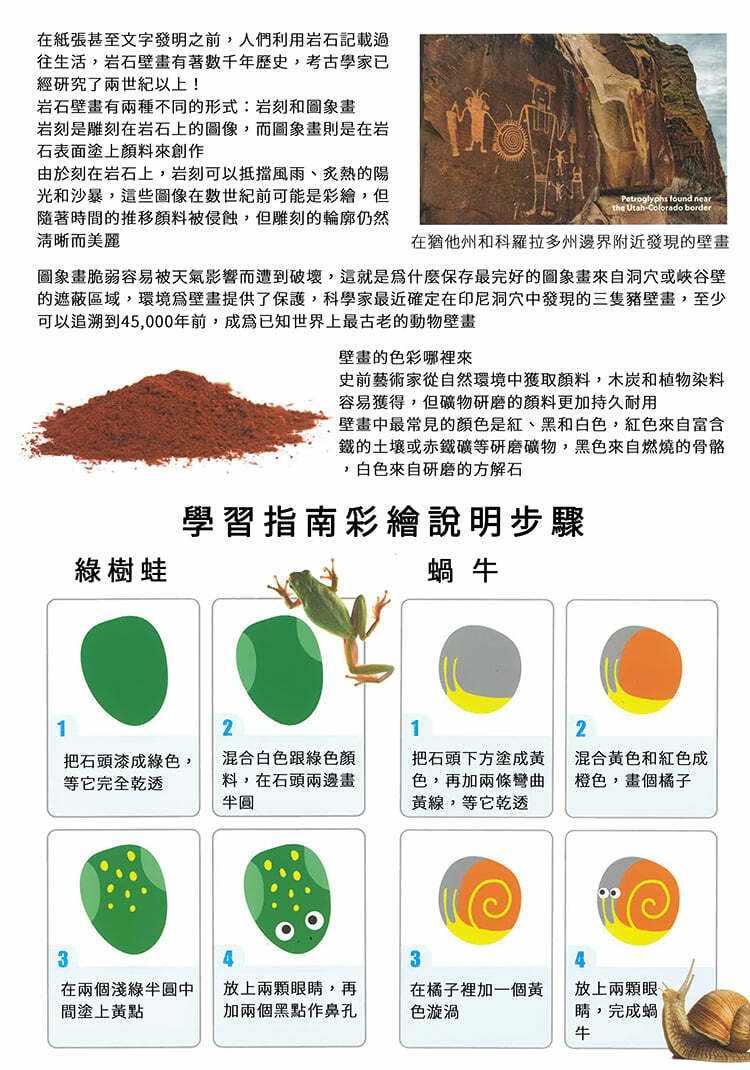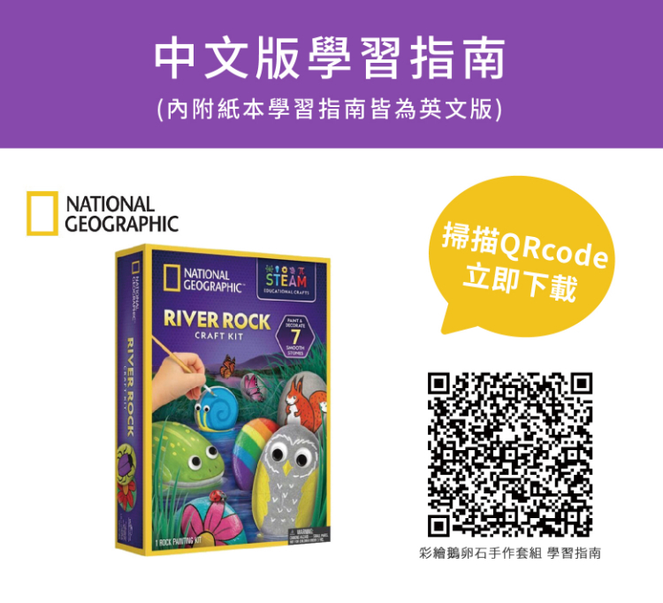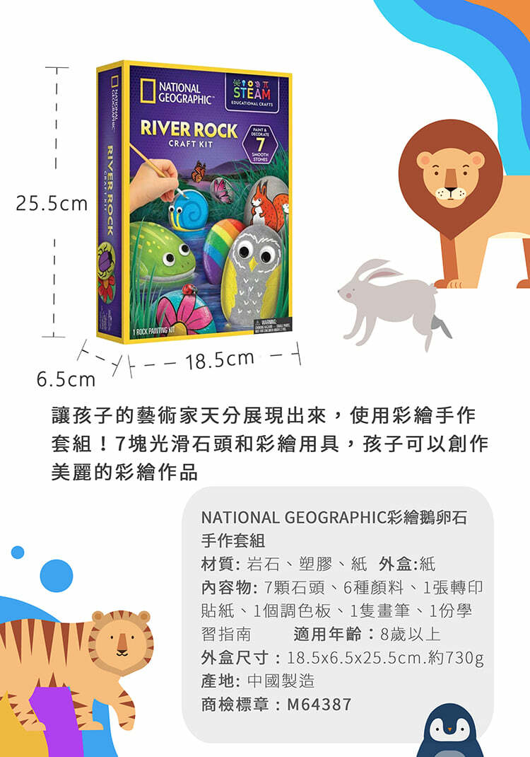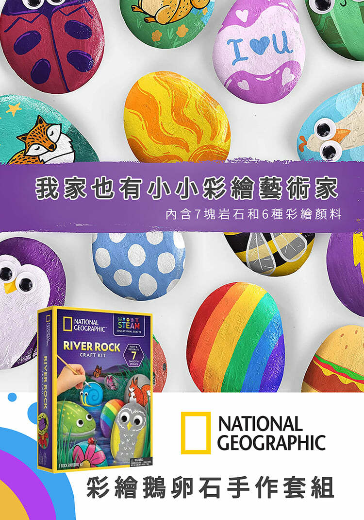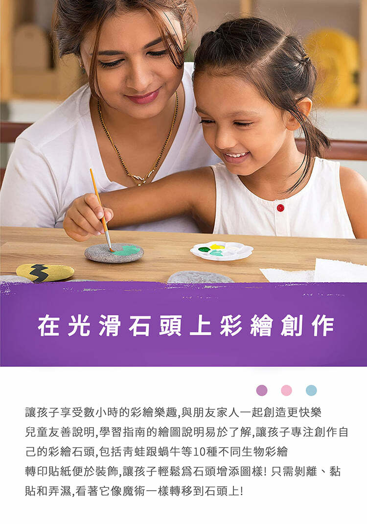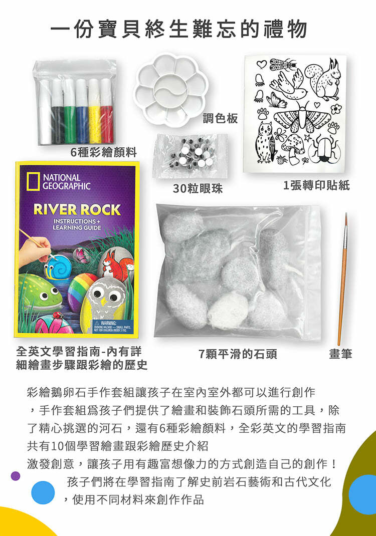 7塊光滑石頭和彩繪用具,還有轉印貼紙及動動眼等配件輕鬆為石頭增添趣味。